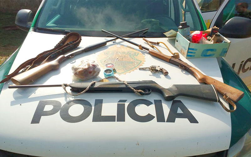 Com informações, os policiais foram até a residência de uma pessoa do sexo masculino que foi questionado sobre a veracidade da denúncia, este confirmou possuir as armas de fogo sob sua posse e que não possui registro junto ao órgão competente. O homem levou a equipe até um cômodo da residência onde foram encontrados os seguintes objetos: uma espingarda calibre 32 marca Rossi, uma espingarda calibre 40 marca e numeração ilegível e um revólver calibre .22 marca Rossi.