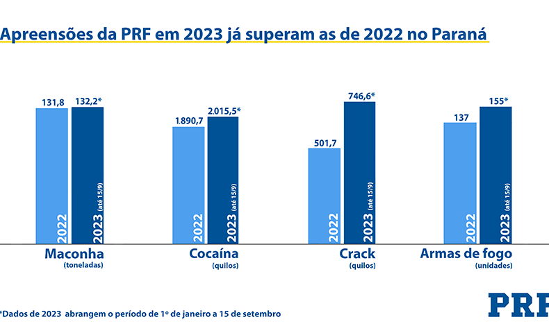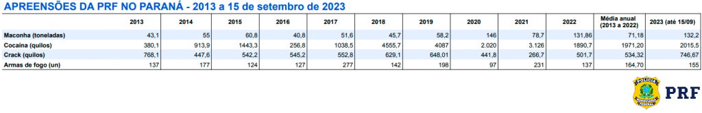 “Faltando mais de três meses para o ano acabar, a PRF já apreendeu mais drogas e armas do que em todo ano de 2022 no Paraná. Esse grande resultado demonstra que, ao mesmo tempo em que priorizamos também a segurança viária, não deixamos em segundo plano o combate ao crime”, explica o superintendente da PRF no estado, Fernando César Oliveira.