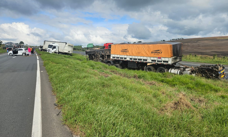 Um engavetamento envolvendo três caminhões, um automóvel e uma van foi registrado no início da tarde desta sexta-feira (6), por volta das 12h20, no km 525 da BR-376, em Palmeira, nos Campos Gerais do Paraná. O acidente causou interdição parcial da rodovia e deixou passageiros feridos.