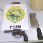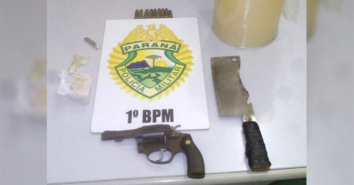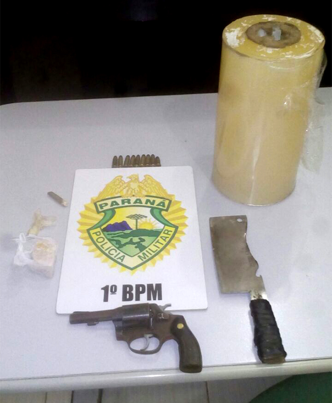 A equipe abordou o suspeito na frente da sua residência, e no momento em que ele estava de posse de um cigarro de maconha. Após realizar buscas foi localizado sob o pneu de um carro que estava no quintal um revólver cal. 38 com 9 munições intactas do mesmo calibre.