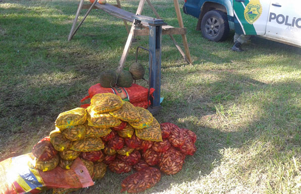 Ao realizar a abordagem foi verificado que o responsável não possuía nenhum documento de origem do produto, os pinhões estavam esbranquiçados e com alto teor de umidade, os frutos (pinhas) estavam com coloração verde e foram colhidas em período proibido.