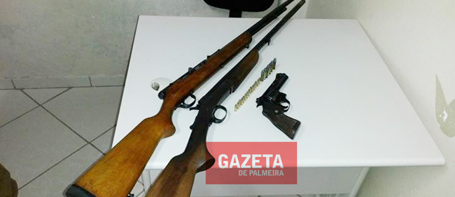 Após alguns minutos o homem retornou a residência e mostrou o local onde as armas estavam guardadas. Elas estavam no interior da mata, escondidas entre os arbustos e cobertas por folhas. No local foi encontrado um revólver calibre .38 com oito munições intactas, uma espingarda calibre .28 sem munições e um rifle calibre .22 com 14 munições intactas.
