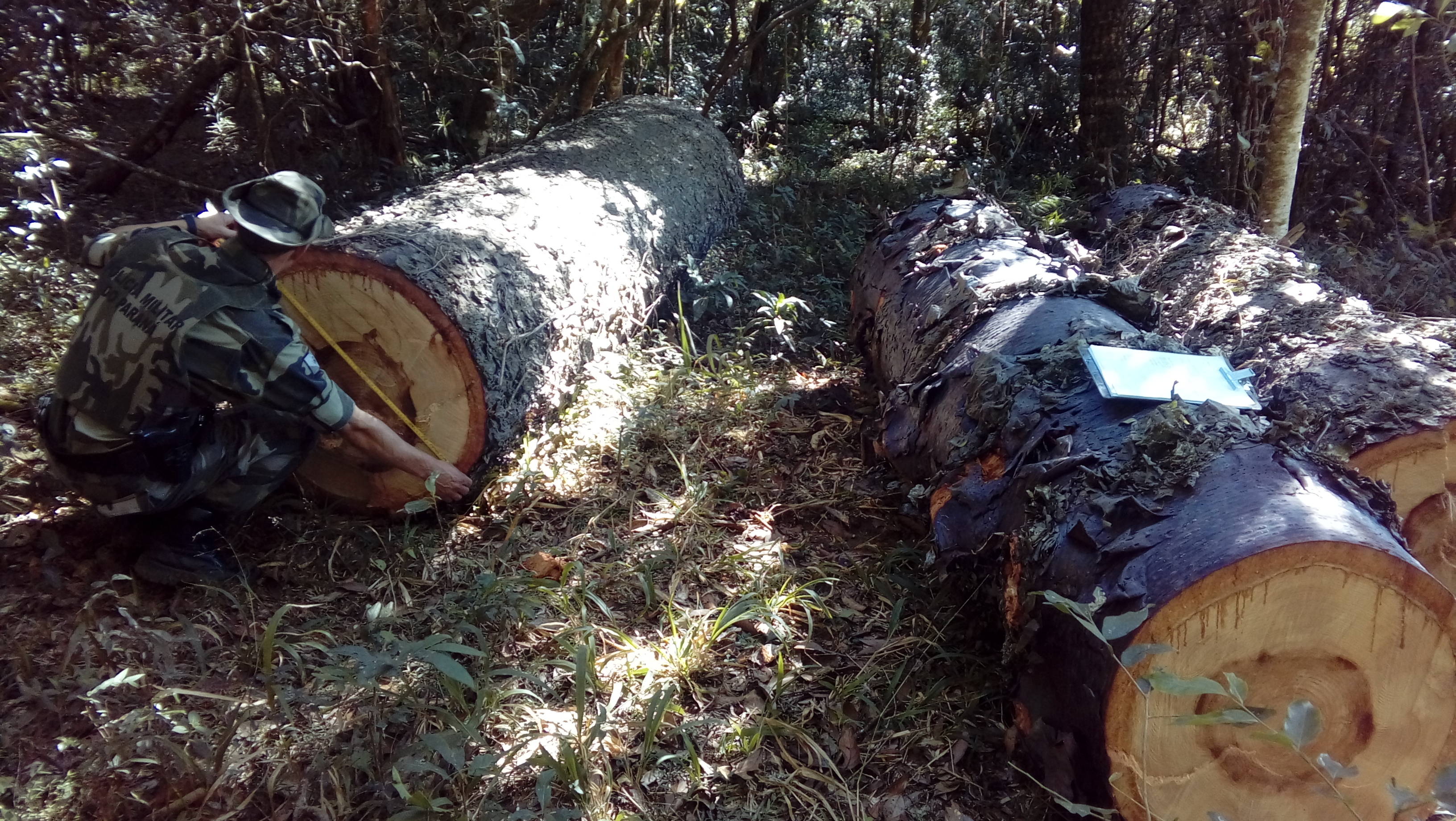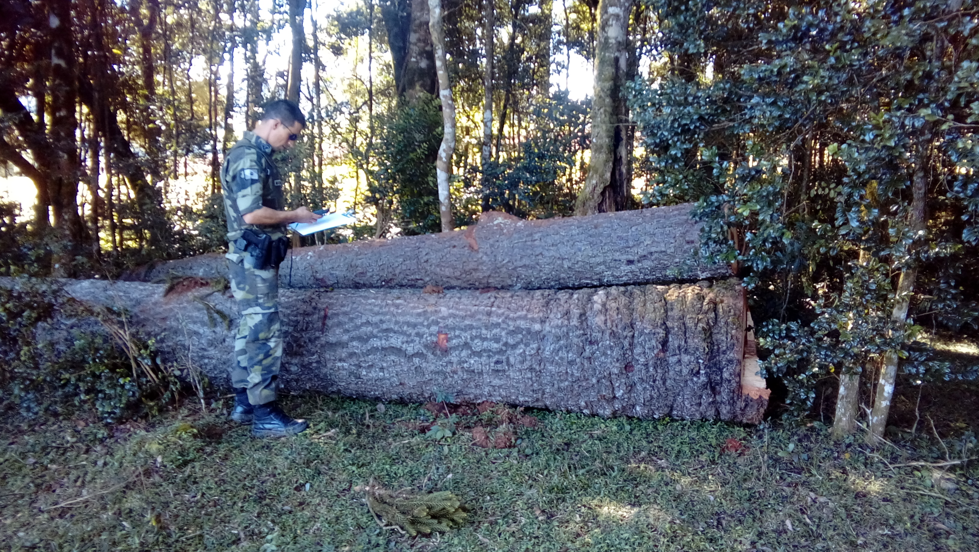 Na mesma localidade e em atendimento a denúncia corte ilegal de pinheiros, a equipe policial realizou vistoria na propriedade e constatou o corte isolado de 2 (dois) pinheiros araucária em ambiente agropastoril, espécie constante na lista oficial da flora brasileira ameaçada de extinção, categoria ‘vulnerável”. O proprietário afirmou não possuir autorização florestal para o corte. Diante do fato foi lavrado o Termo Circunstanciado ao Juizado Especial Criminal de Palmeira. No local estão depositadas 3 (três) toros de pinheiro, totalizando 3.243 m³, os quais foram apreendidos e ficaram depositados na propriedade até decisão da autoridade competente. Será comunicado o IAP de Ponta Grossa para providências administrativas.