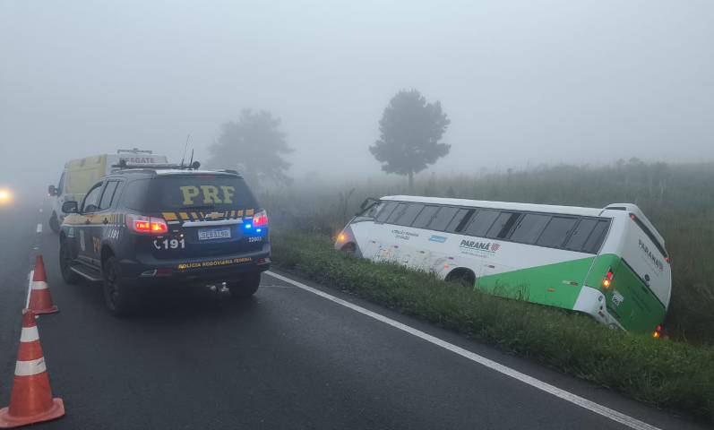 Um ônibus da Secretaria de Saúde de Prudentópolis saiu da pista e tombou na madrugada desta sexta-feira, 20 de fevereiro de 2026, por volta das 5h, no km 149 da BR-277, em São Luiz do Purunã, município de Balsa Nova.