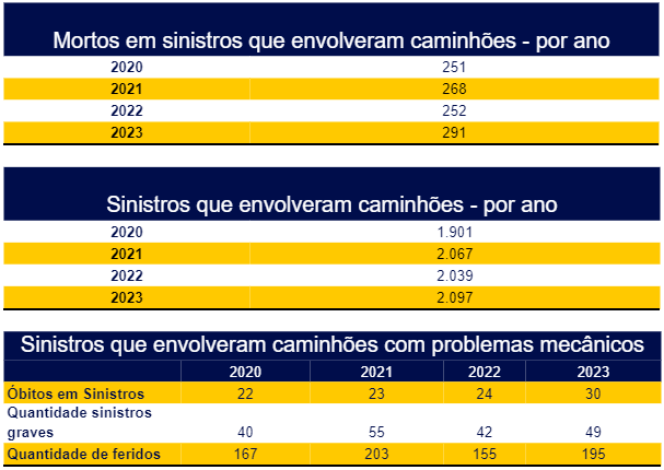 Chama atenção nos dados o aumento 15% de óbitos em sinistros envolvendo caminhões – 252 mortos em 2022 e 291 em 2023. O aumento de mortes acompanha o aumento de outros números de sinistralidade em caminhões, incluindo a quantidade de acidentes classificados como graves. A PRF também observou um aumento nos números de óbitos em sinistros que envolveram caminhões com problemas mecânicos: 25% mais óbitos em acidentes com esse registro.