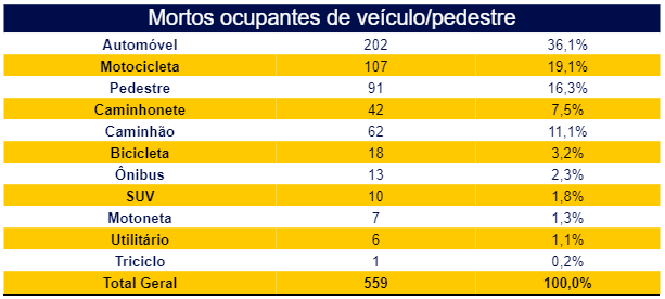 O segundo tipo de sinistro que mais causou mortes em 2023 no Paraná foi o atropelamento de pedestres: 90 pessoas perderam a vida. O período da noite, incluindo os momentos de baixa luminosidade em amanhecer e anoitecer, concentrou 75% das mortes neste tipo de sinistro. Mortes em razão da ausência de luz natural podem ser evitadas principalmente com comportamento preventivo por parte de motoristas e pedestres. Os pedestres, nas rodovias, devem caminhar no sentido contrário ao fluxo de veículos, atravessar a via nas passarelas, quando disponíveis, e à noite, buscar utilizar roupas claras e uma lanterna para se tornarem mais visíveis. Isso tudo sem esquecer do mais importante: estar atento ao acessar a rodovia para a presença de veículos. Já os motoristas, legalmente responsáveis pela segurança de pedestres, como previsto no CTB, devem realizar a manutenção de seus veículos, com atenção ao funcionamento dos faróis e respeitar as regras de trânsito, principalmente reduzindo a velocidade do veículo ao se aproximar de locais de travessia de pedestres e em locais de visibilidade reduzida. Os pedestres compõe ainda outro grupo de atenção, pela fragilidade frente aos demais veículos: 40% dos mortos em sinistros de trânsito eram pedestres ou ocupavam motocicletas, motonetas ou bicicletas.