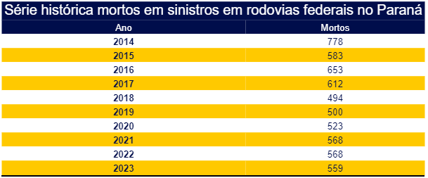 Em 2023, nas rodovias federais do Paraná, foram contabilizados 6.827 sinistros de trânsito, que provocaram a perda de 559 vidas. Os números são menores do que em 2022, quando 568 pessoas morreram em 7.113 sinistros. Dos sinistros de 2023, 1.929 foram considerados graves – quando ocorre lesão grave ou morte de pelo menos um dos envolvidos.