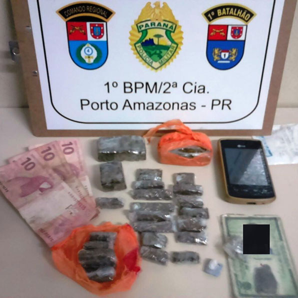Denúncias anônimas informaram a Polícia Militar de Porto Amazonas de que estaria ocorrendo tráfico de drogas em uma residência na rua Rodolfo Cassou, na tarde de sábado (19). Os PMs foram até o local para verificar o fato e abordaram um rapaz, momentos após o mesmo sair da residência.