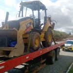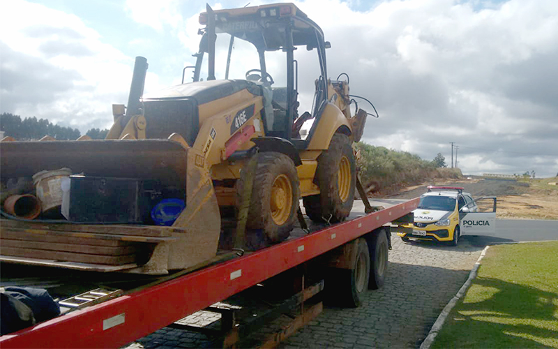 Na manhã da quarta-feira (25) a Polícia Militar recebeu uma ligação anônima, através do 190, onde uma pessoa informou que havia uma máquina tipo retroescavadeira em cima de um caminhão plataforma no pátio de um posto de combustíveis no km 169 da BR 277, que seria produto de furto.
