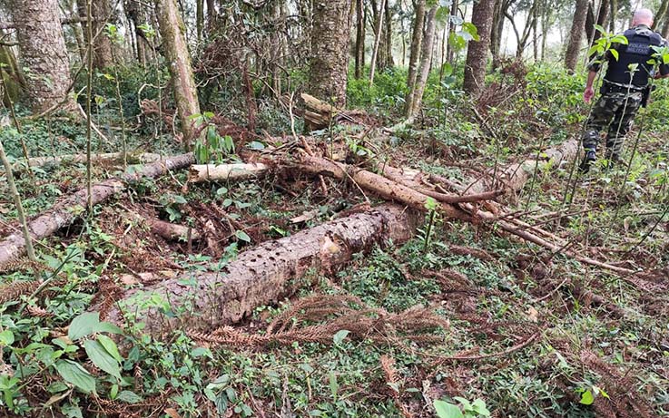 Nesta quarta-feira (10), a Polícia Ambiental atendeu uma denúncia que resultou na constatação de danos em uma propriedade rural na localidade de Vilinha, interior de de Palmeira. A fiscalização constatou a destruição de vegetação nativa em uma área de 0,1 hectare, devido à abertura de uma estrada que atingiu a espécie pinheiro araucária, considerada ameaçada de extinção.