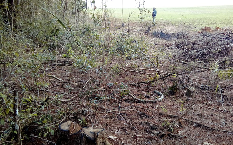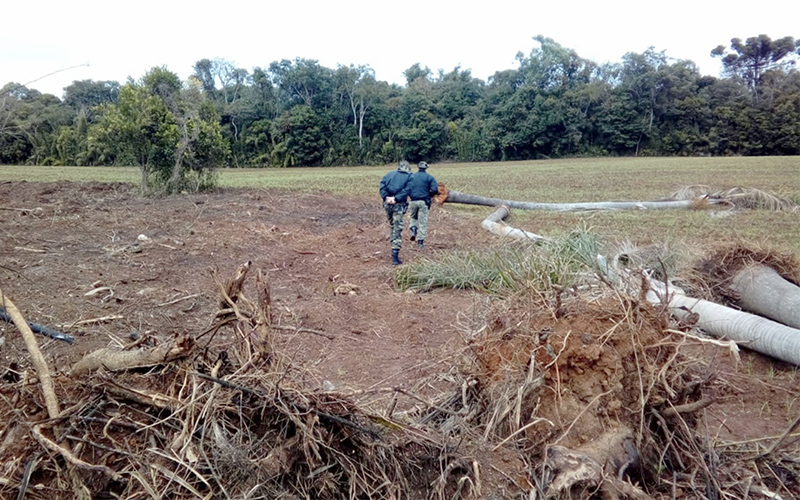 Na localidade de Pinheiral dos Malucelli, a equipe constatou a destruição de floresta secundária em estágio médio de regeneração do bioma mata atlântica, em área correspondente a 0,07 ha., com a derrubada de 12 palmeiras, entre outras árvores nativas como miguel pintado, canela guaica e guabirobeira. No local também foi constatado o funcionamento de uma pocilga com 5 porcos, em área de preservação permanente. O proprietário relatou não possuir autorização ambiental, motivo pelo qual será comunicado o IAP de Ponta Grossa e a Delegacia de Polícia Civil de Palmeira para as medidas pertinentes nas esferas penal e administrativa.