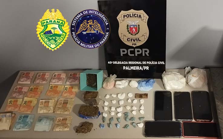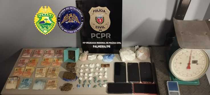 Já no período da tarde, em outra ação de averiguação, a equipe da Polícia Militar se deslocou até uma propriedade rural localizada em Rincão do Coxo, no interior do município de Palmeira, suspeita de ser utilizada como depósito de grandes quantias de entorpecentes. No local foi encontrada maconha e cocaína, e centenas de embalagens plásticas utilizadas para embalar e vender o produto. Foram colhidas informações, em conjunto com equipe da Polícia Civil, de que boa parte da droga estaria em uma camionete Kia/Sorento para ser comercializada. Diante destas novas informações, a polícia conseguiu abordar o veículo, sendo que os suspeitos confessaram os atos ilícitos, relatando que realizaram a entrega de aproximadamente 40 quilos de maconha na cidade de Ponta Grossa, recebendo o valor de R$ 30 mil pela droga, e parte deste valor foi depositado em contas de terceiros e parte na conta particular de um dos suspeitos, e que ainda trazia dentro do veículo o valor de R$ 4.900,00 em dinheiro, proveniente da venda da droga. Diante dos fatos todos os envolvidos receberam voz de prisão.