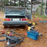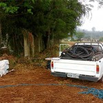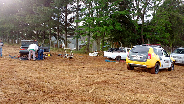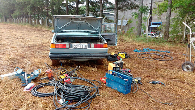 Os bandidos deixaram para trás as ferramentas e grande quantidade de cabos de cobre que foram furtados e também os dois veículos, um Ford Pampa com placas de Guaratuba e um Santana de Piraquara que foram utilizados na ação e já estavam carregados para a fuga.