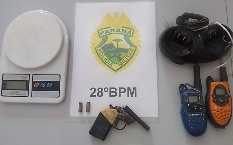 Na residência um segundo elemento foi detido e próximo a ele estava uma mochila, a qual continha uma pistola com duas munições deflagradas, uma balança de precisão, e dois rádios comunicadores, que segundo informações serviam para avisar sobre a presença da polícia.