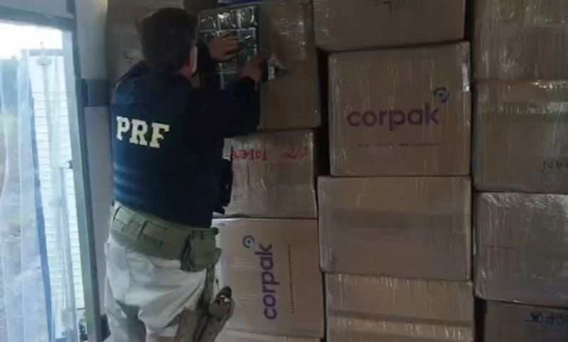 Por volta das 7h00, equipes da PRF abordaram um caminhão Volvo VM 290, de placas de Jundiaí (SP). Ao ser questionado sobre a carga, o motorista informou que o veículo estava vazio e se dirigia a Curitiba para carregamento. Contudo, uma inspeção minuciosa no compartimento de carga revelou a existência de uma divisória oculta, onde foram encontradas diversas caixas contendo produtos ilícitos.