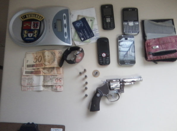 A equipe policial foi até o local e efetuou a abordagem dos cinco indivíduos, além de vistoria na residência. Durante a ação foi encontrado um revolver calibre .32, com seis cartuchos intactos, um cartucho de calibre .22 deflagrado, quatro aparelhos celulares, R$ 201,00, uma balança de precisão e mais alguns objetos.