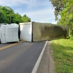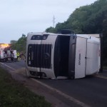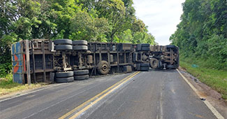Na tarde deste domingo (22), uma carreta carregada com bobinas de plástico tombou na PR 427, na altura do KM 69. O veículo seguia no sentido Porto Amazonas, quando, após a curva, o motorista perdeu o controle e o veículo acabou tombando. O motorista, com suspeita de fratura, foi encaminhado pelo serviço de socorro até a Santa Casa de Palmeira.