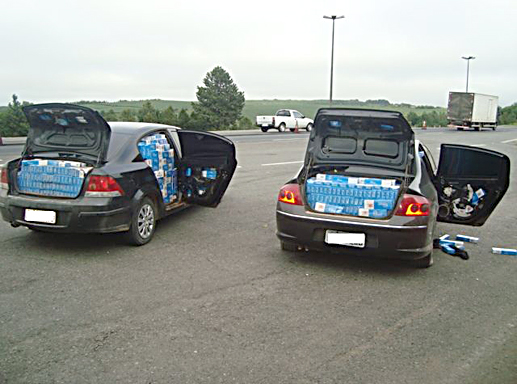 O primeiro veículo abordado foi um Vectra, com placas do Paraná, que transportava uma grande quantidade de cigarros. Logo atrás, um Peugeot 407 fez um retorno brusco ao visualizar a viatura, sendo acompanhado em seguida pelos policiais. Uma hora depois, o veículo foi encontrado abandonado, em uma área rural, com as portas trancadas e carregado com o mesmo produto. Os sinais de identificação nos vidros estavam raspados e o chassi estava cortado. Após consulta ao sistema, descobriu-se que as placas do Paraná também eram falsas, sendo o veículo proveniente de Bombinhas/SC.