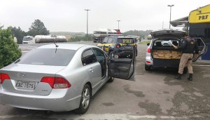 Os agentes da PRF realizavam a abordagem em frente à UO, no km 139 da BR, quando apreenderam o carregamento de maconha que vinha no sentido da capital. A droga estava em um veículo Hyundai Santa Fé prata, placas DZG-1788, ocupado por um casal. Um veículo Honda Civic prata, de Foz de Iguaçu/PR, estava de batedor do Santa Fé com as drogas.