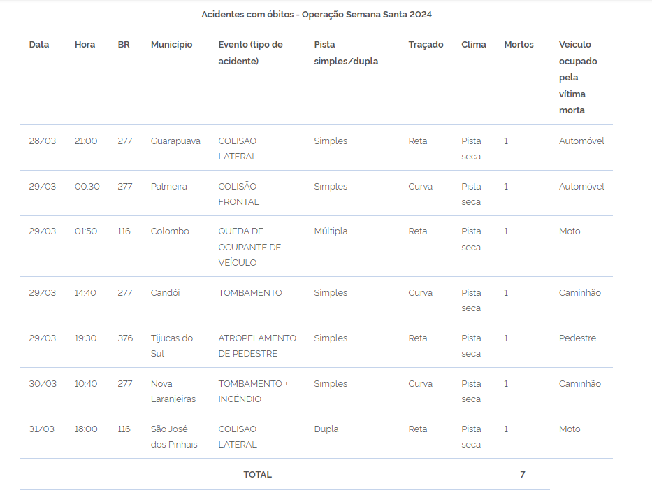 Durante o período, a PRF registrou sete mortes em sinistros de trânsito nas rodovias federais do Paraná durante a Operação Semana Santa. Preliminarmente, observou-se que os sinistros de trânsito têm relação com comportamento dos usuários das rodovias: atitudes como excesso de velocidade, ultrapassagens de risco e falta de atenção à condução estão ligadas a esses sinistros.