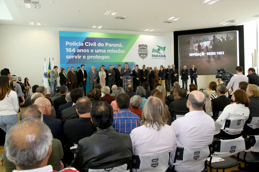 O governador Beto Richa participou na terça-feira (26) da solenidade que comemorou os 164 anos da Polícia Civil do Paraná e destacou os investimentos do Governo do Estado na corporação. Ele lembrou que, desde 2011, foram contratados 1.800 profissionais, entre delegados, investigadores, escrivães e papiloscopistas. “A Polícia Civil é muito valorizada e foi reestruturada no nosso governo. Os novos profissionais fortaleceram a estrutura da corporação, já que 44% do efetivo atual foi contratado na nossa gestão”, afirmou. Hoje, todas as comarcas do Estado contam com delegados.