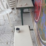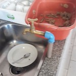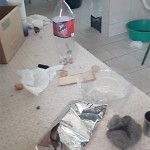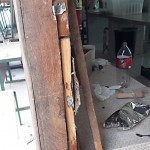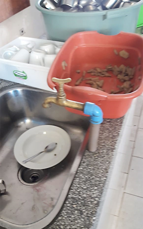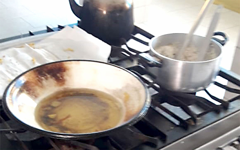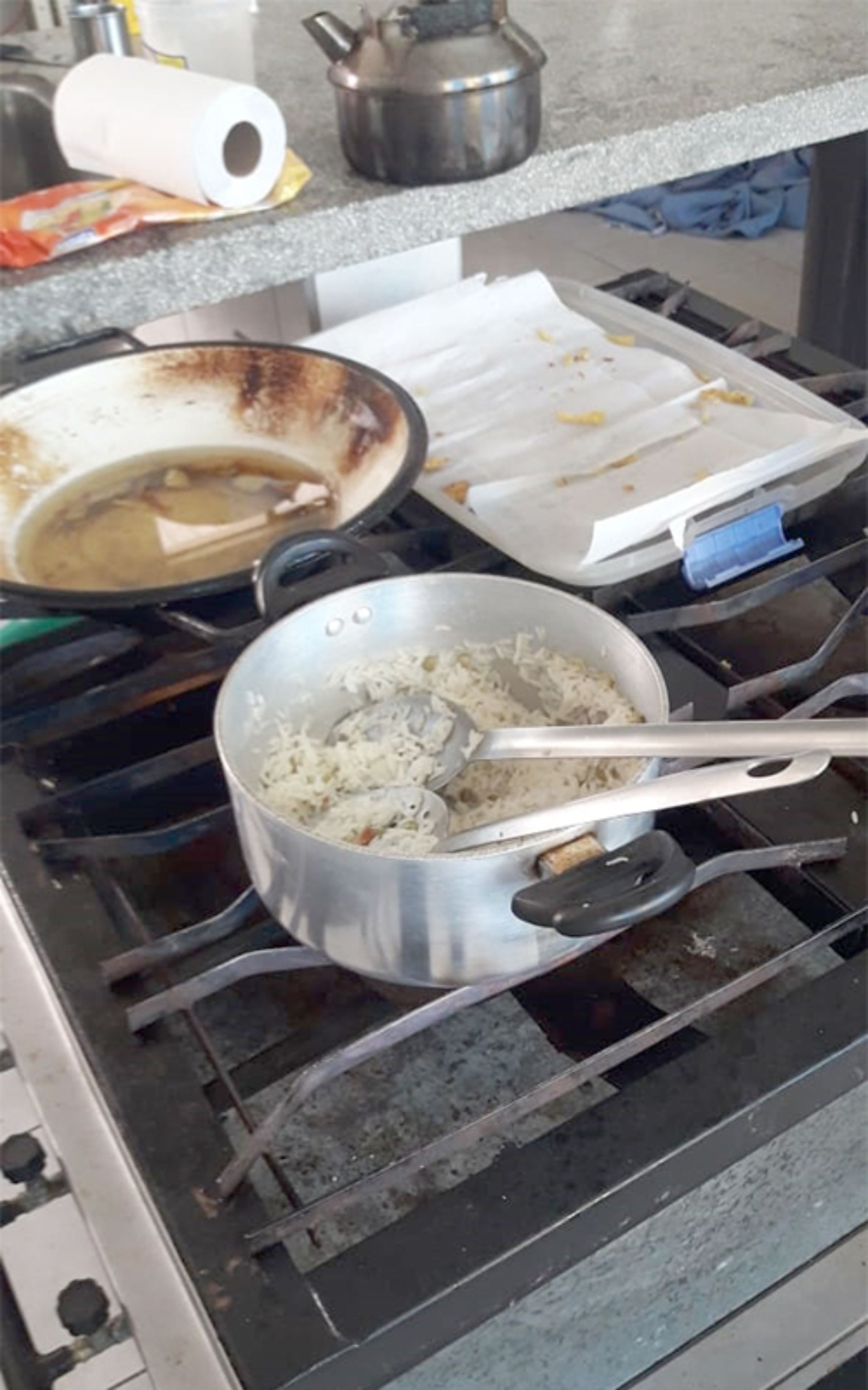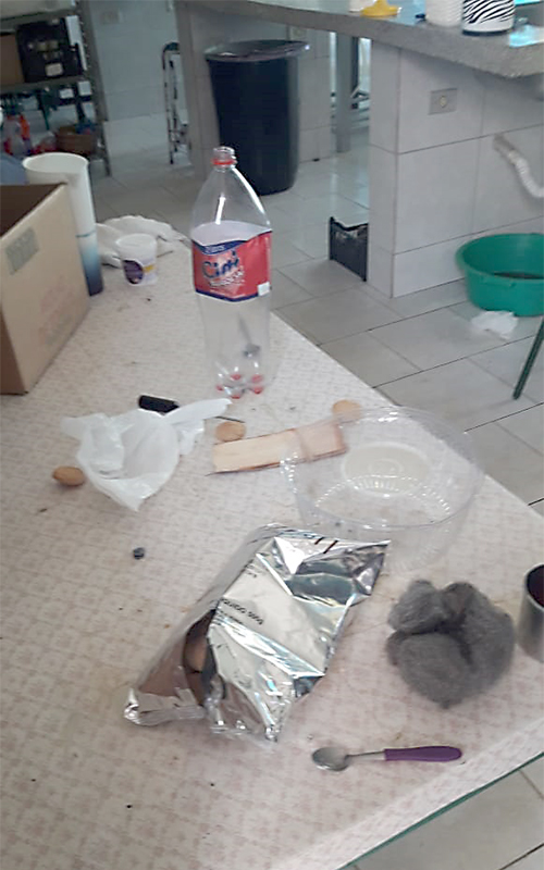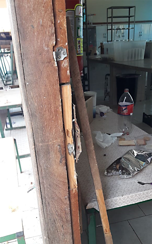 A porta de madeira que dava acesso à cozinha ficou bastante danificada. No interior do ambiente foi possível constatar que os invasores deixaram muita sujeira e que chegaram a cozinhar arroz e fritar batatas para consumir durante a ação criminosa.
