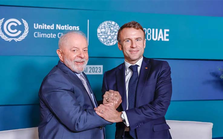 “Com o Brasil, estamos determinados a preservar as florestas. Nos próximos três anos, a França dedicará 500 milhões de euros à sua preservação”, disse Macron. A declaração veio acompanhada de uma foto dele com o presidente Luiz Inácio Lula da Silva em uma reunião bilateral na Conferência das Nações Unidas sobre Mudanças Climáticas de 2023 (COP28), nos Emirados Árabes.
