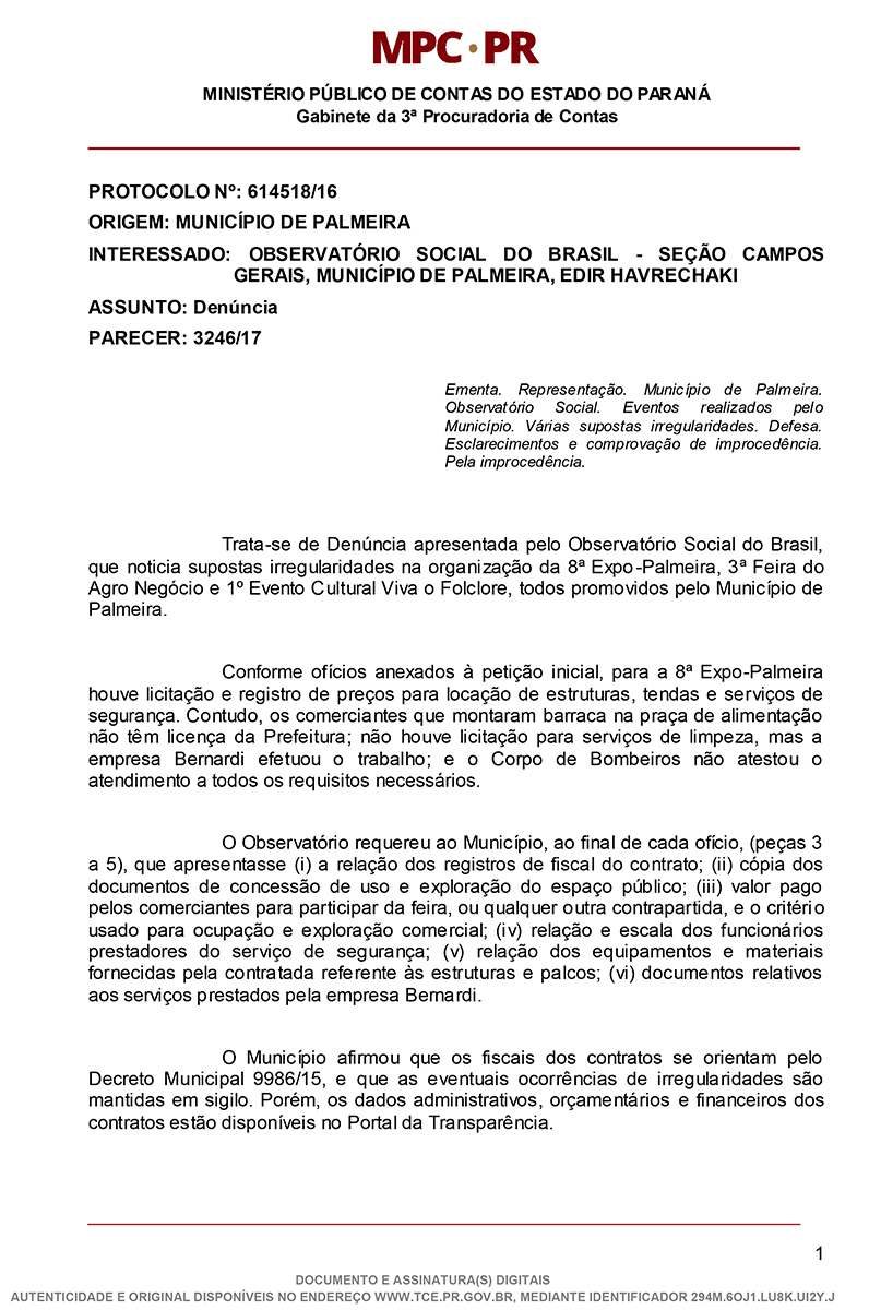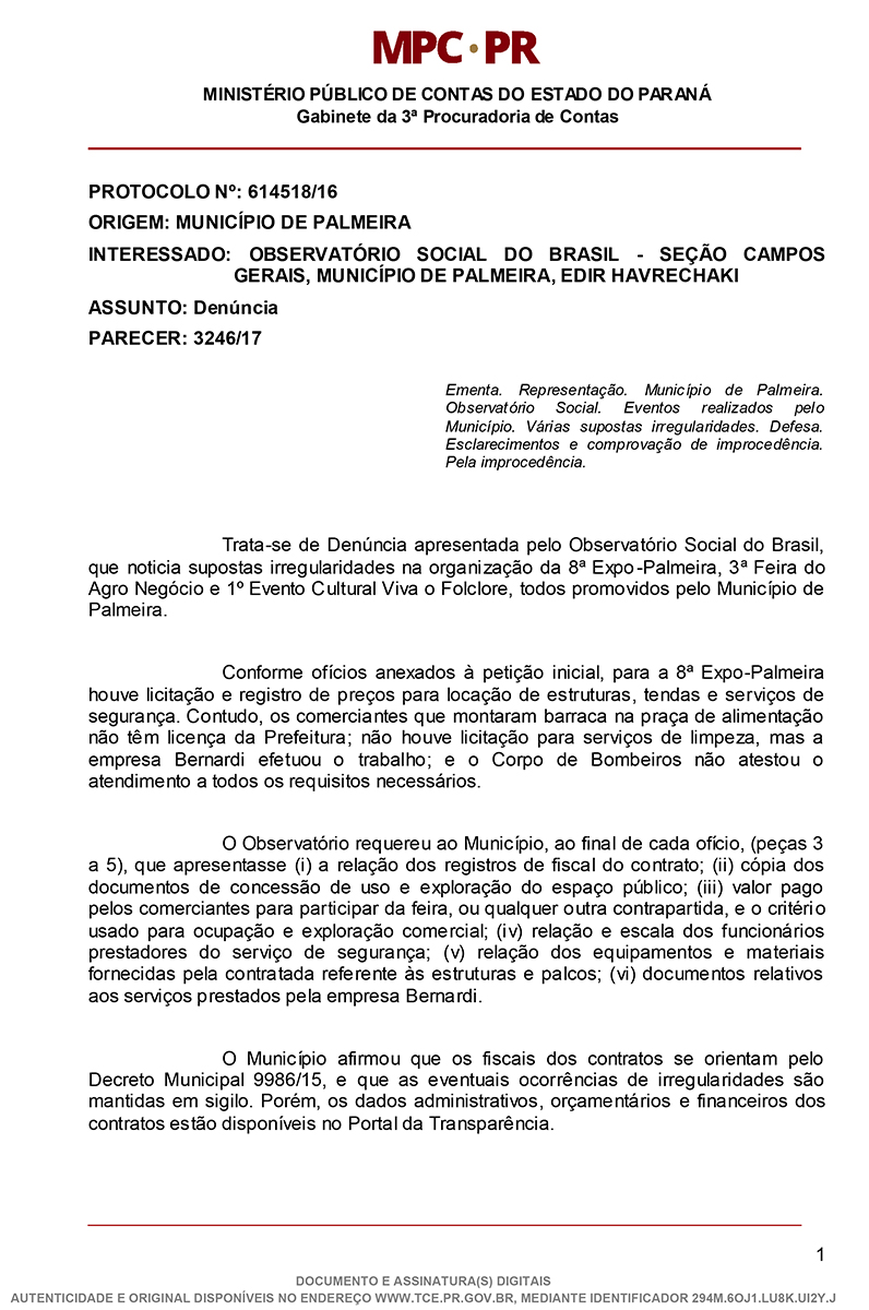 Com o diagnóstico, o MPC-PR vê a denúncia com supostas irregularidades relacionadas à 8ª Expo-Palmeira, 3º Feira Agro Negócio e Viva o Folclore protocolada pessoalmente pelo presidente do Observatório Social (OBS), Ney da Nobrega, como improcedente, uma vez que, segundo o relatório, o Município de Palmeira apresentou prontamente as devidas respostas, e os fatos apresentados pelo OBS não mostram causa efetiva de qualquer prejuízo ao erário.