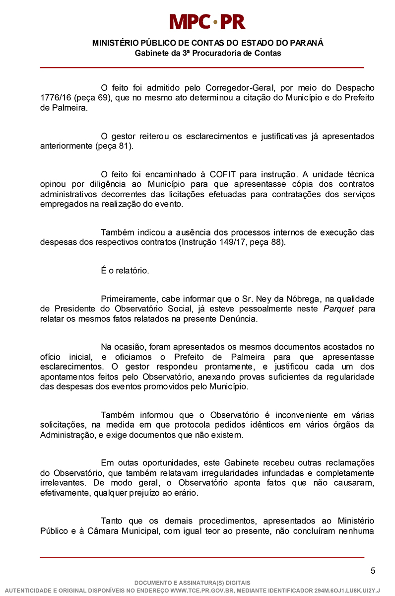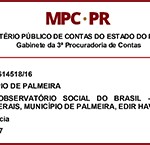 Em análise do Ministério Público de Contas do Estado do Paraná (MPC-PR), no dia 17 de abril, a procuradora Eliza A. Z. K. Langner, deu seu parecer sobre a denúncia do Observatório Social contra o Município de Palmeira.