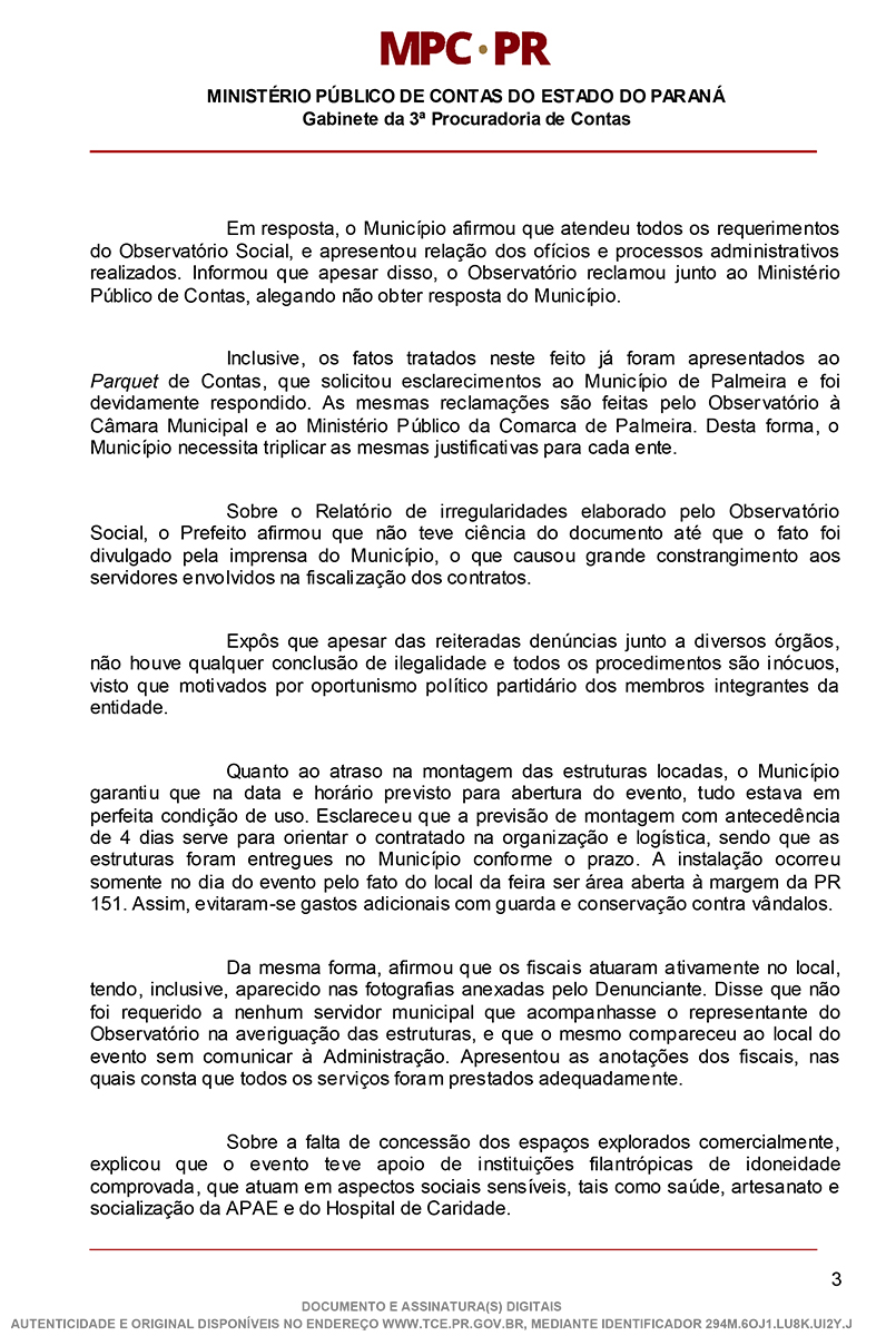 Ainda conforme relatório, o MPC-PR oficiou o prefeito de Palmeira, que nas palavras da procuradora, “respondeu prontamente, e justificou cada um dos apontamentos feitos pelo Observatório, anexando provas suficientes da regularidade das despesas dos eventos promovidos pelo Município”, disse Langner.