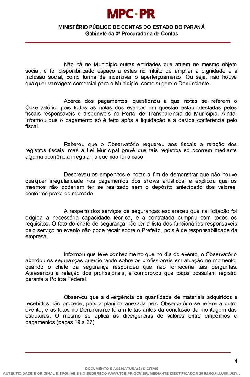 No parecer do MPC-PR, consta ainda, que “a divergência da quantidade de materiais adquiridos e recebidos não procede, pois a planilha anexada pelo Observatório se refere a outro evento, e as fotos do denunciante foram feitas antes da conclusão da montagem das estruturas”, diz relatório.