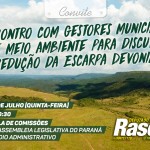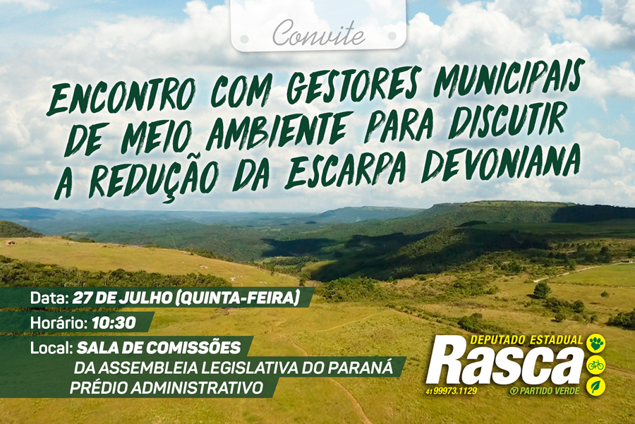 A Comissão de Ecologia, Meio Ambiente e Proteção aos Animais (CEMA), presidida pelo deputado estadual Rasca Rodrigues (PV), convocou para quinta-feira (27), em Curitiba, os secretários municipais de Meio Ambiente (ou diretores) dos 12 municípios que integram os limites atuais da Área de Proteção Ambiental (APA) da Escarpa Devoniana. Na pauta, a discussão do polêmico projeto que pretende reduzir em 68% os limites da APA, que tramita na Assembleia Legislativa do Paraná.