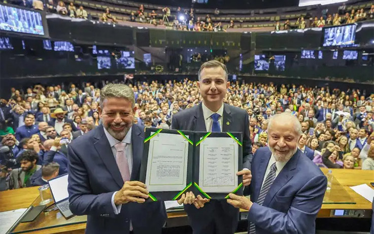 A votação do texto havia sido concluída pela Câmara dos Deputados no último dia 15. Lula compareceu à cerimônia, realizada no Plenário da Câmara, que também contou com as presenças do presidente do Senado e Congresso, Rodrigo Pacheco (PSD-MG); da Câmara dos Deputados, Arthur Lira (PP-AL); e do Supremo Tribunal Federal (STF), Luís Roberto Barroso, além dos ministros Fernando Haddad (Fazenda) e Simone Tebet (Planejamento), e centenas de deputados e senadores.