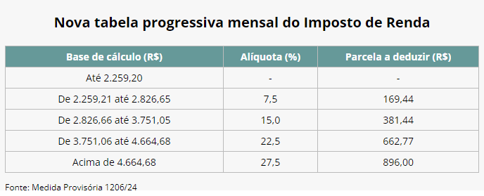 De acordo com a Agência Câmara de Notícias, a MP corrige a primeira faixa da tabela e eleva o limite de aplicação da alíquota zero, que passará de R$ 2.112,00 para R$ 2.259,20.