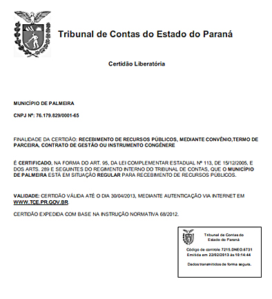 Desde o último dia 22, quando foi emitida, a Prefeitura de Palmeira já conta com certidão liberatória do Tribunal de Contas do Estado do Paraná, que estava bloqueada em virtude de omissão de cobranças de dívidas e não atendimento à determinação do órgão quanto a contratações irregulares. A emissão da certidão não se deu porque a Prefeitura Municipal resolveu as pendências, mas porque o presidente do TC, conselheiro Artagão de Mattos leão, determinou a emissão do documento a todos os 302 municípios paranaenses que tiveram novos prefeitos eleitos no ano passado.