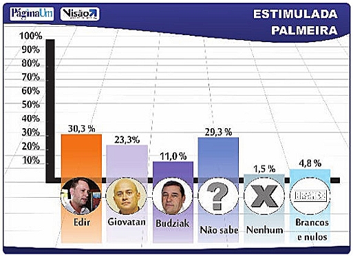 A primeira pesquisa eleitoral sobre a preferência do eleitorado de Palmeira, registrada e divulgada  pela edição de sexta-feira do jornal Página Um, de Castro, mostra que o candidato a prefeito Edir Havrechaki (PSC) tem 7% de vantagem sobre o segundo colocado na sonfdagem o candidato Giovatan de Souza Bueno (PSDB). Havrechaki aparece com 30,3% e Bueno com 23,3%, enquanto o candidato Inácio Budziak (PDT), aparace 11% das intenções de votos. A margem de erro da pesquisa é de 4,87%. O estudo mostra, ainda, que os indecisos são 29,3% dos entrevistados entre os dias 25 e 28 de setembro.