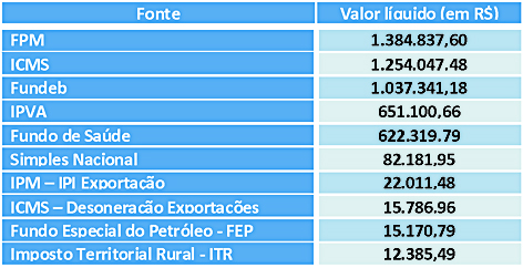 Outra fonte importante de transferência, o Fundo de Participação dos Municípios (FPM), no mês de fevereiro, repassou R$ 1.384.837,60. Este valor é 13,5% maior do que o recebido em fevereiro de 2015, quando o repasse líquido transferido pelo FPM foi de R$ 1.218.657,54. Os dados são do Sistema de Informação do Banco do Brasil.