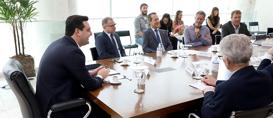 O governador Carlos Massa Ratinho Junior recebeu nesta segunda-feira (4) os presidentes da Associação Comercial Industrial de Chapecó (ACIC), Leonir Antônio Broch, e da Aurora Coop, Neivor Canton, para apresentar o estágio atual do projeto da Nova Ferroeste aos empresários. A estrada de ferro, que vai conectar de forma mais eficiente os produtores de grãos e de proteína animal das regiões Sul e Centro-Oeste, está em fase final de licenciamento ambiental.