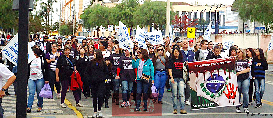 Mais uma manifestação com a presença de professores e estudantes de Palmeira e de outros municípios da região aconteceu na tarde de quinta-feira (14). O ato teve a intenção de lembrar e repudiar a ação policial contra manifestantes, em Curitiba, no último dia 29 de abril, quando mais de 200 pessoas ficaram feridas com balas de borracha, estilhaços de bombas de efeito moral, gás lacrimogênio e golpes de cassetete. Uma exposição de fotografias, promovida por alunos do curso de Jornalismo da Universidade Estadual de Ponta Grossa, expôs as marcas deixadas pelas agressões.